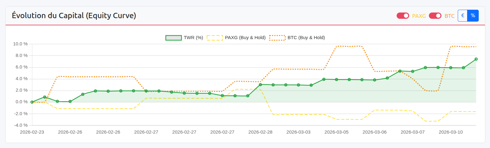 Pourquoi l’or comme référence, et pas le BTC ? Parce que l’or ne ment pas. Il ne fait pas +50 % en trois mois pour repartir à zéro. Il capitalise lentement, silencieusement, depuis des siècles. C’est le baromètre honnête — celui contre lequel une stratégie sérieuse doit se mesurer.